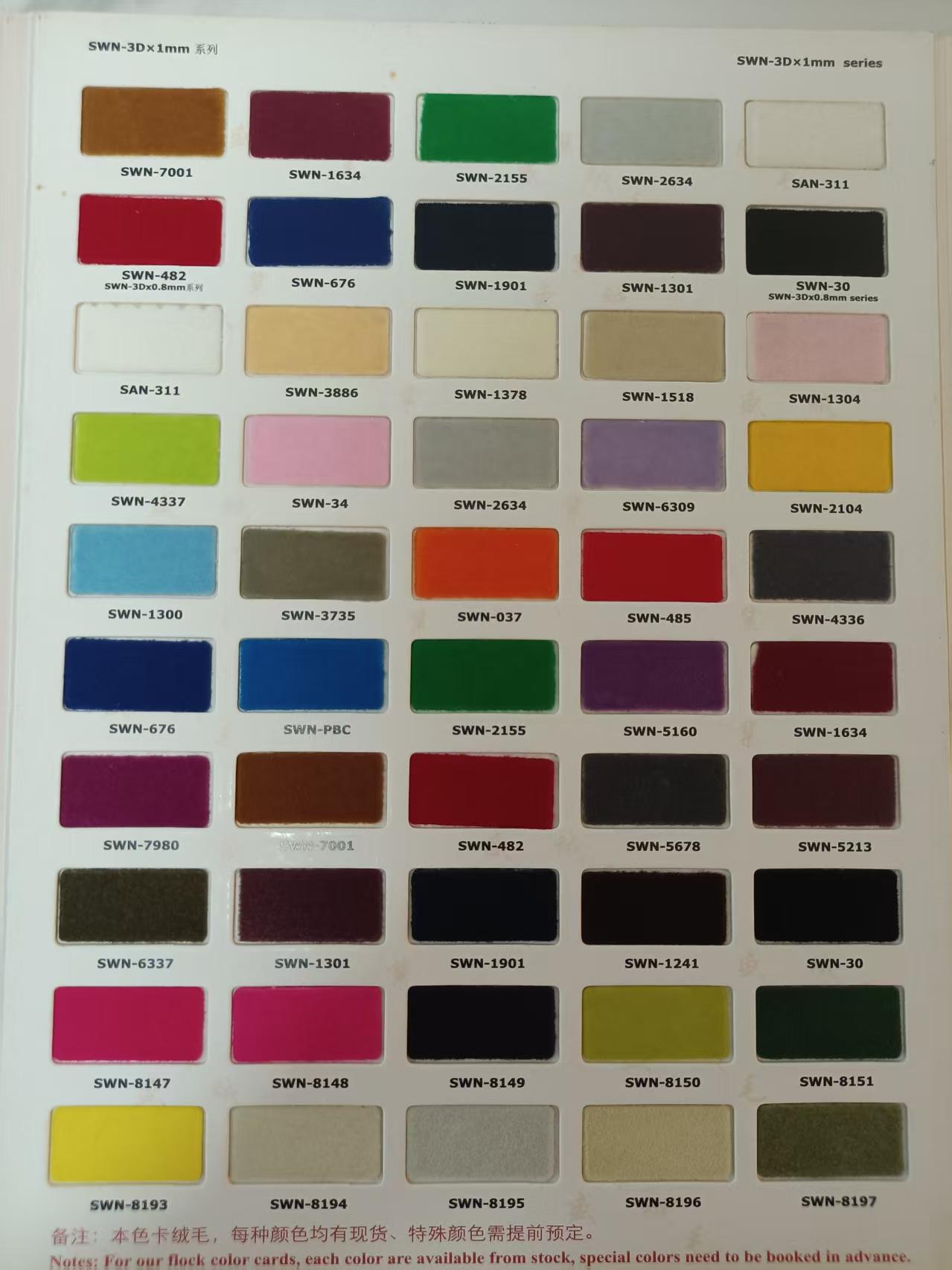 静电绒毛:尼龙、粘胶、綪纶,涤纶四大系列,规格齐全。全进口材料生产的SWN、SWO,SYO系列水洗绒毛(水洗不褪色,能达到世界各地对服装的水洗色牢度要求),TD首饰盒、AR圣诞树、AN纸口、工艺品等专用绒毛,透明毛等,环保、无毒!库存大量现货,颜色多达上千种。另有汽车内饰专用绒毛